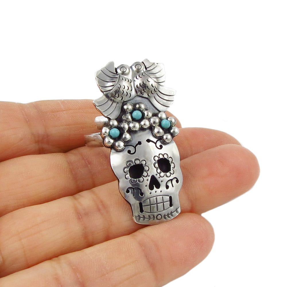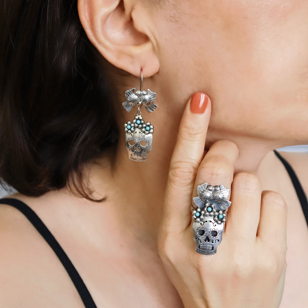 Handmade in sterling silver, her sculpted designs are a unique and vivid celebration of life and death. Each piece, from radiant sugar skulls to ethereal La Catrina lady skeleton figures, becomes a wearable altar of love, remembrance, and transformation — a vivid reminder to cherish your ancestors and an invitation to wear your stories.