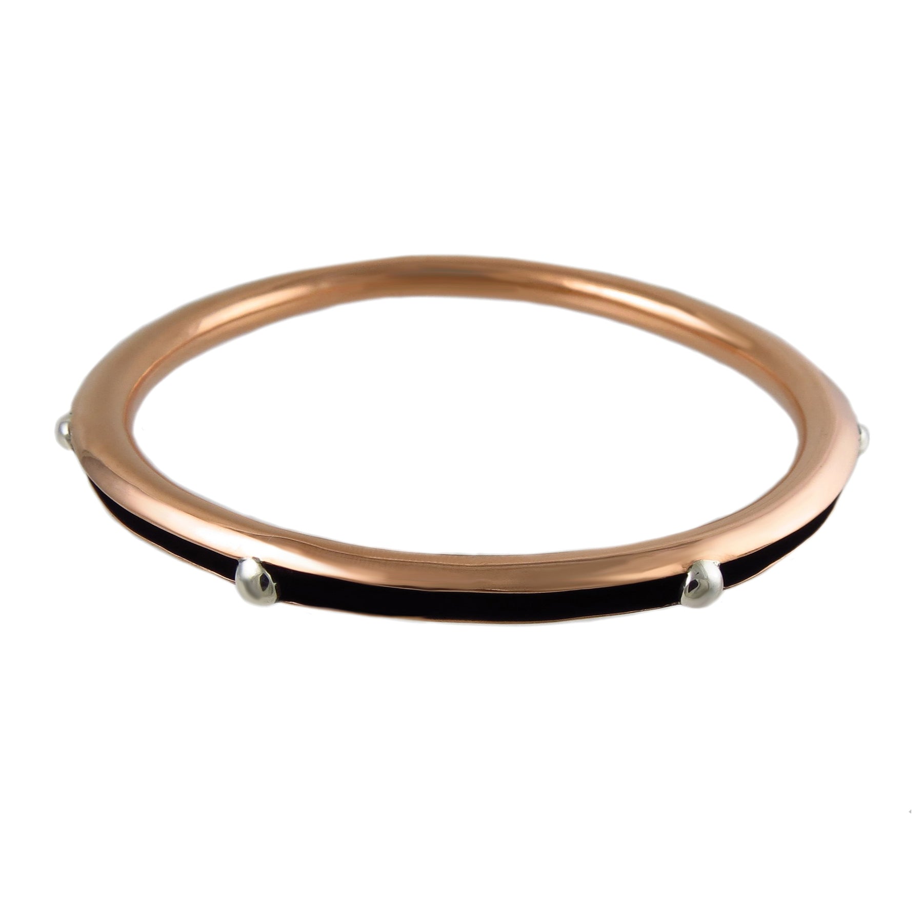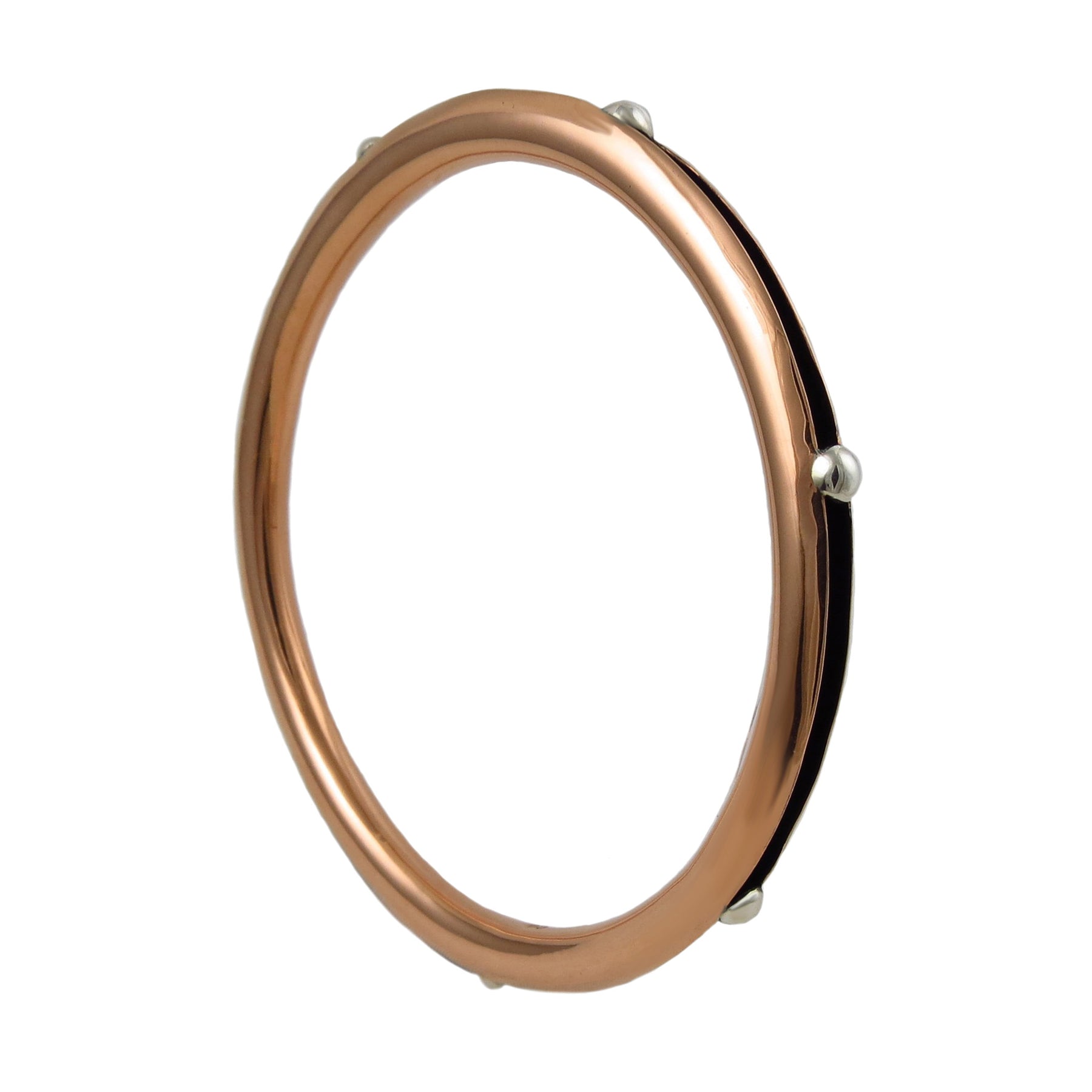 Polished copper circles the wrist in light and dark in this channel cut tube two tone bangle with modern edge. Silver beads add splashes of light to this exclusive mixed metal bangle for women.