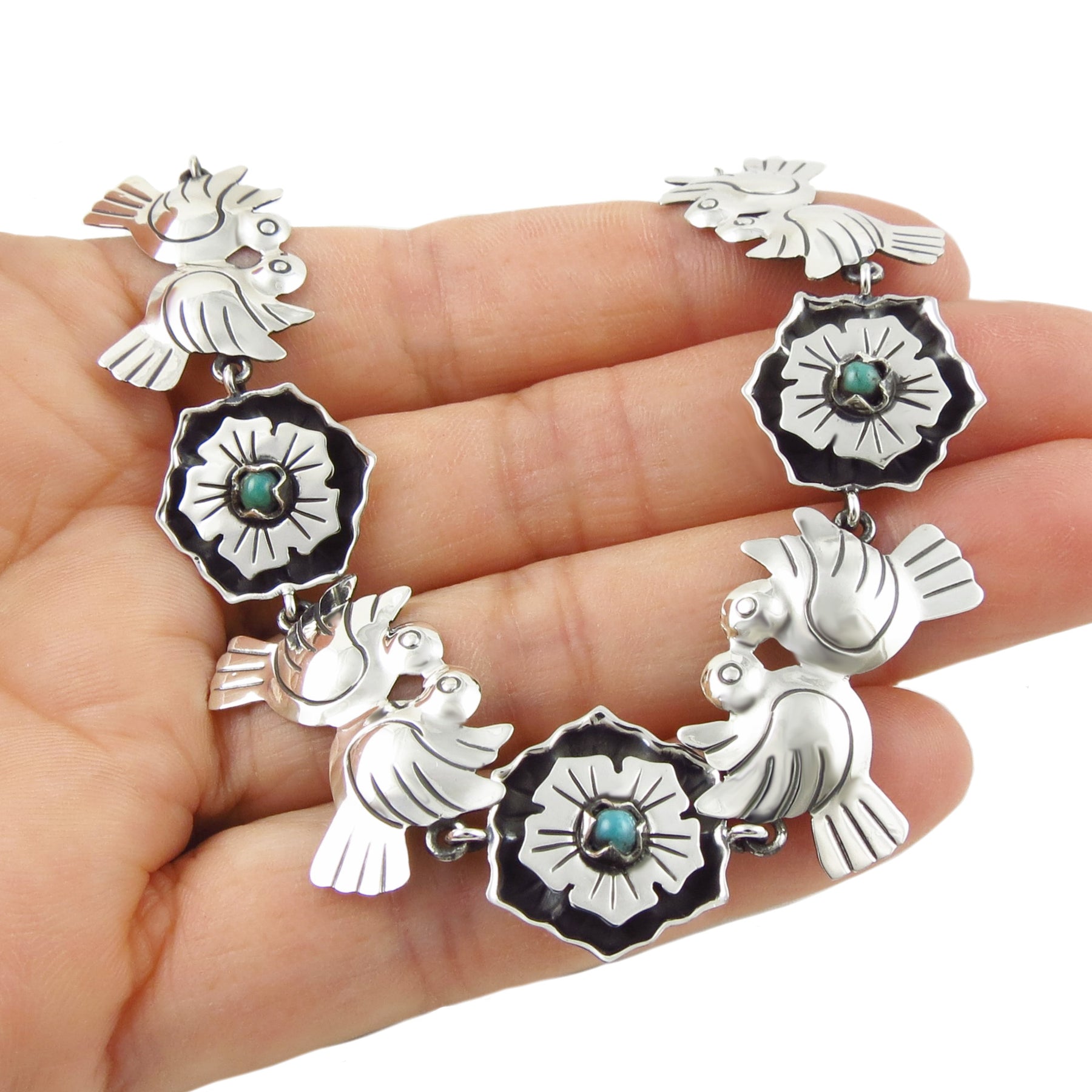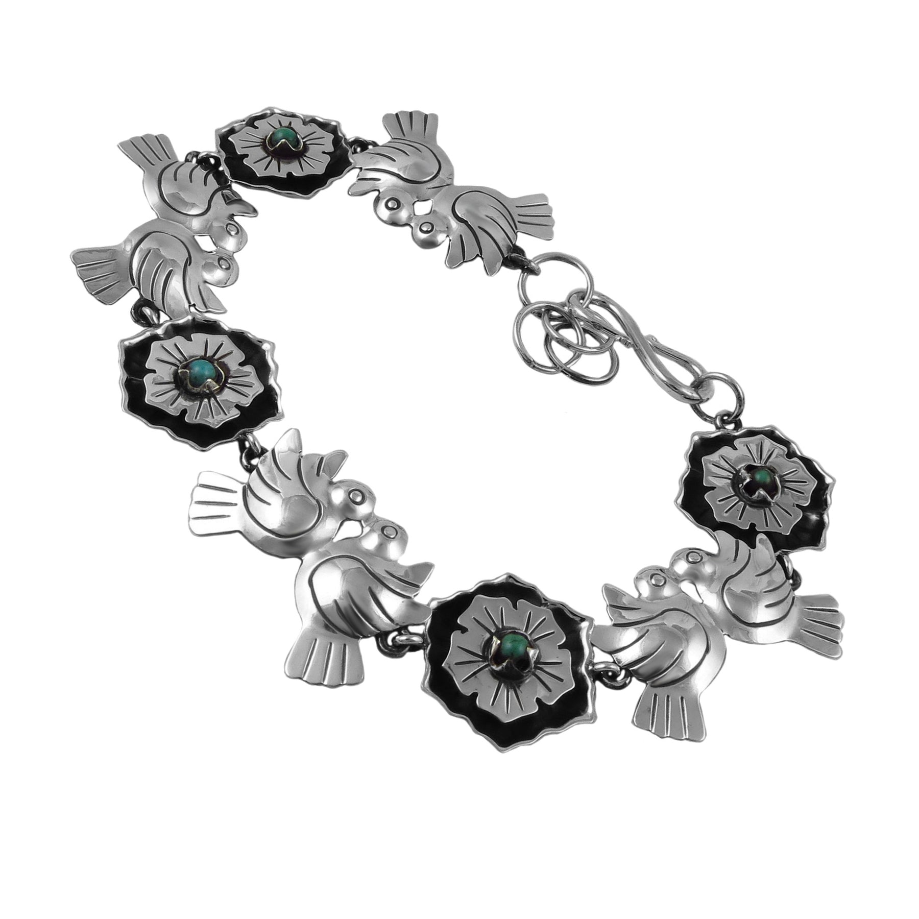 This beautiful handmade silver bracelet is inspired by vintage Mexican jewellery design. Entirely hand-wrought from 925 silver, the design features lovebirds nestling between pretty flowers decorated with turquoise beads.