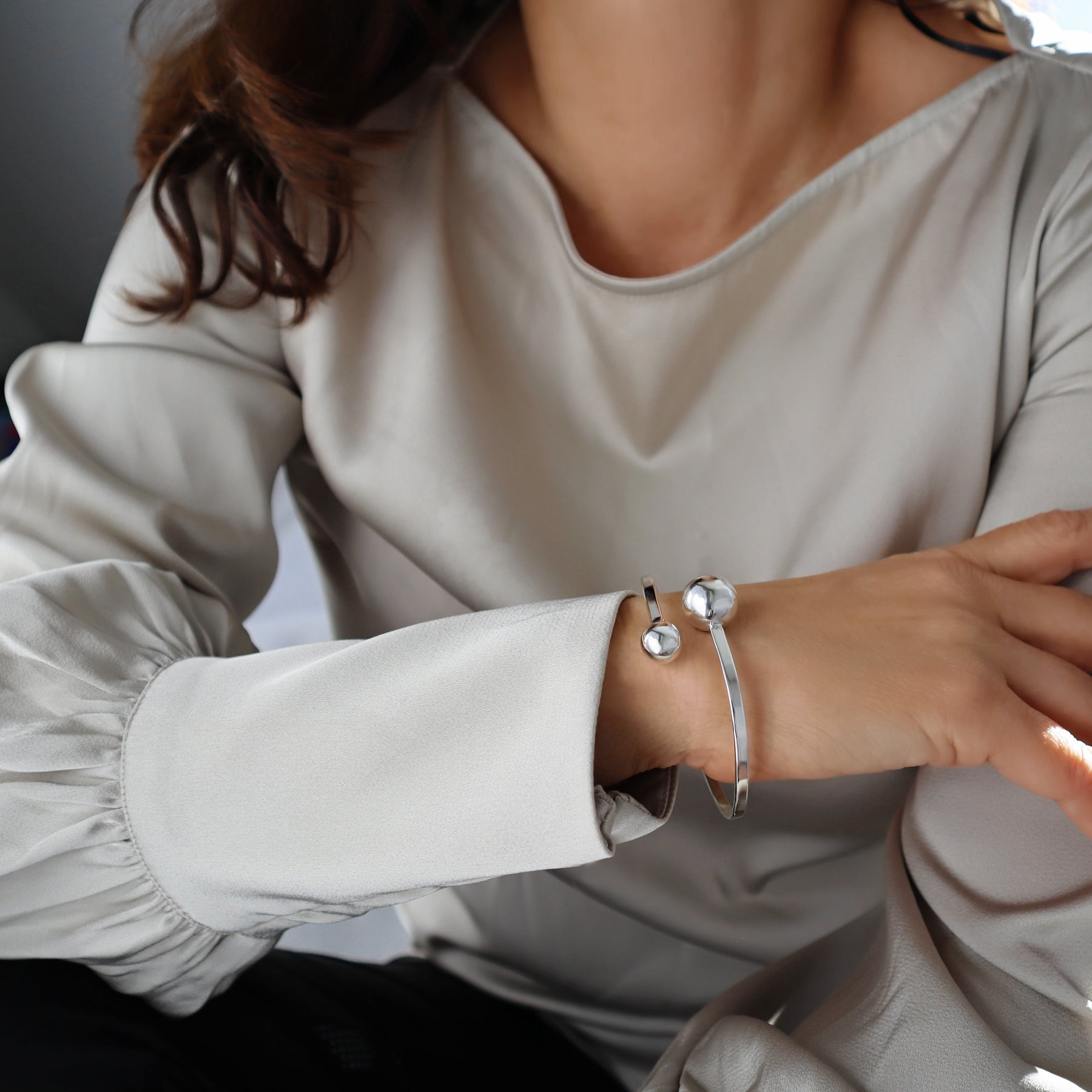 Shiny ball beads decorate the ends of this easy to wear silver bracelet. Wrought from 925 silver, the design is fitted and features a split band.