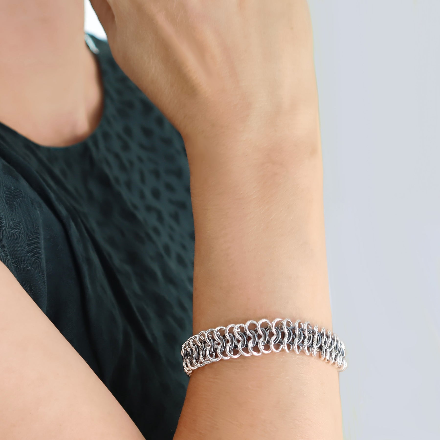 An eye-catching flat cable link design forms the basis of this modernist design. The addition of blackened rings adds an enticing note of dark and light.