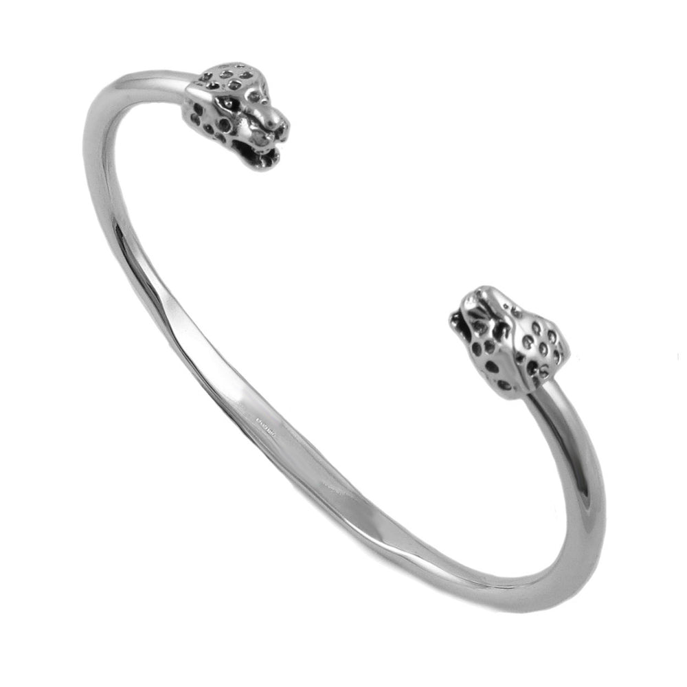Two large cats face off in this exclusive open band bracelet. Indented spots decorate the leopard heads in a dramatic contrast of light and dark.