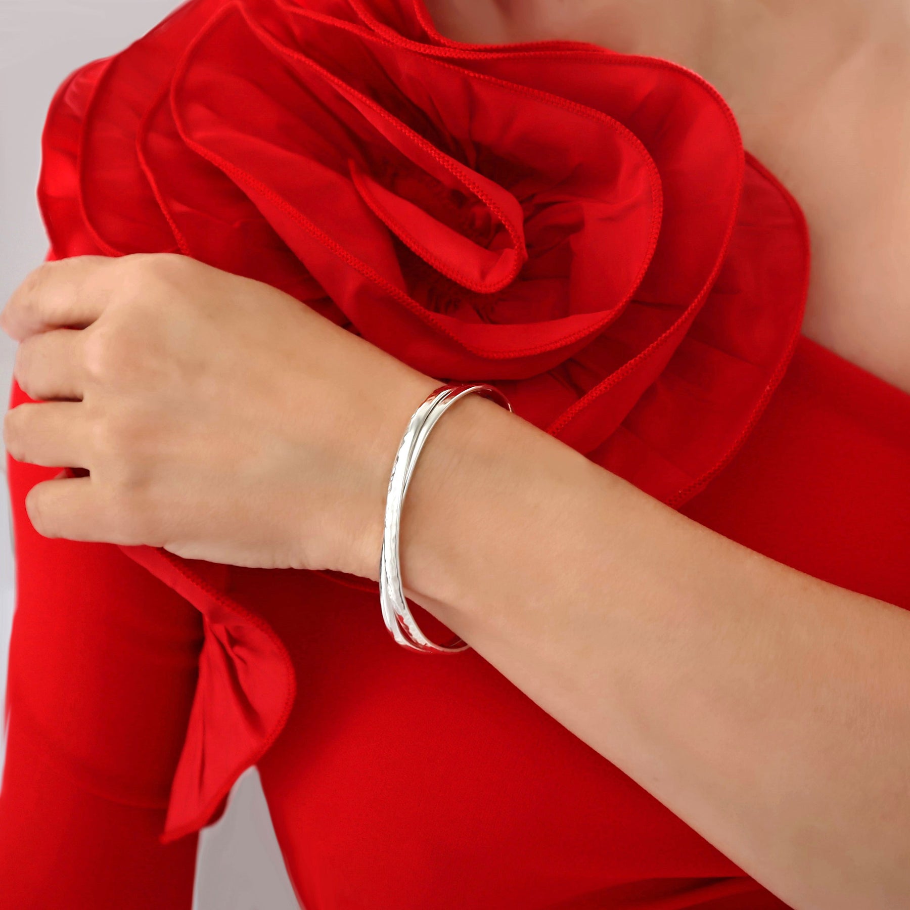 Hand-hammered texture on one band contrasts with a polished finish on the other in this eassily adjustable cuff bracelet.