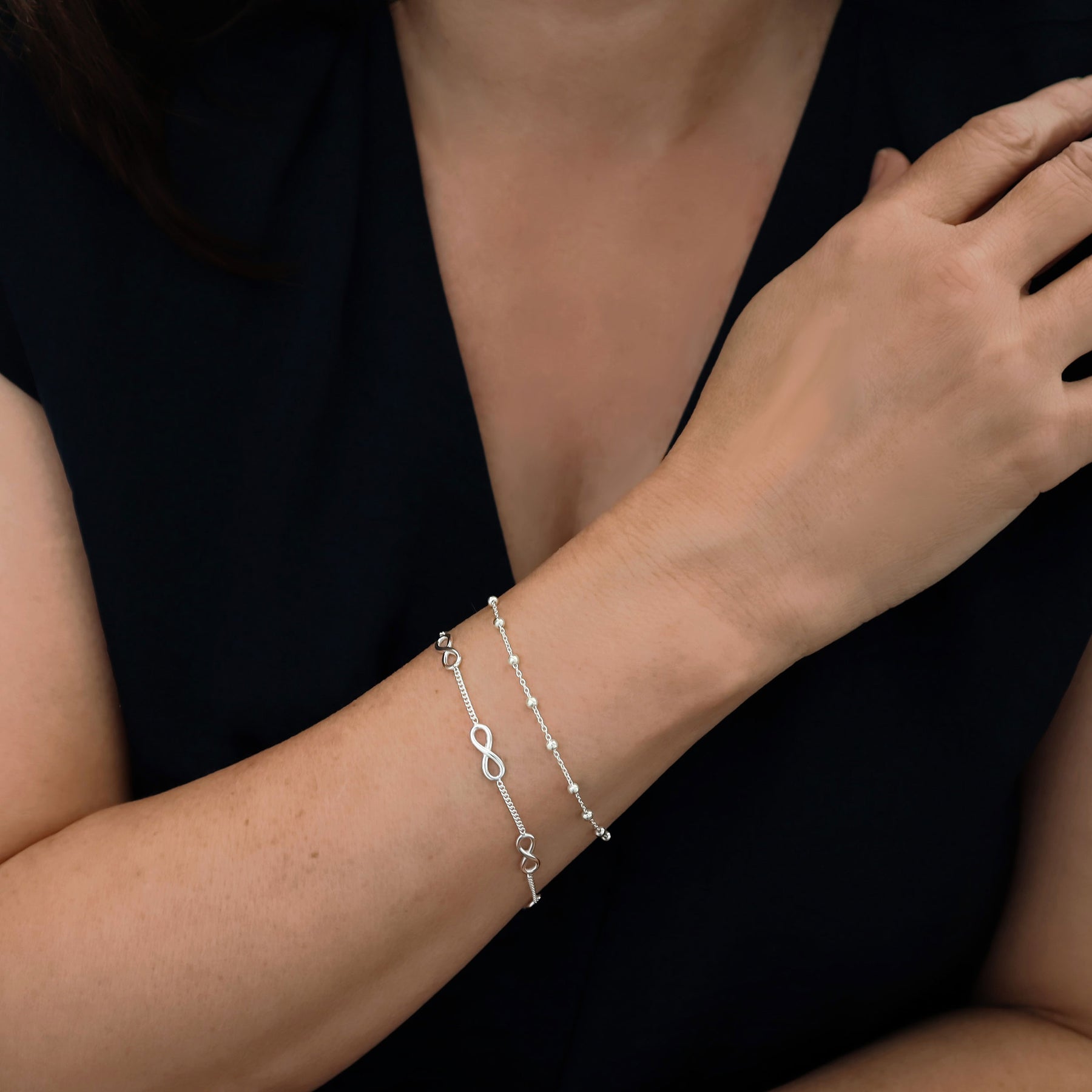 For those who embrace the joy of the infinite -a stacking bracelet featuring figure of eight links framed by a simple chain in a sparkling sterling silver trail that celebrates the power of the endless.