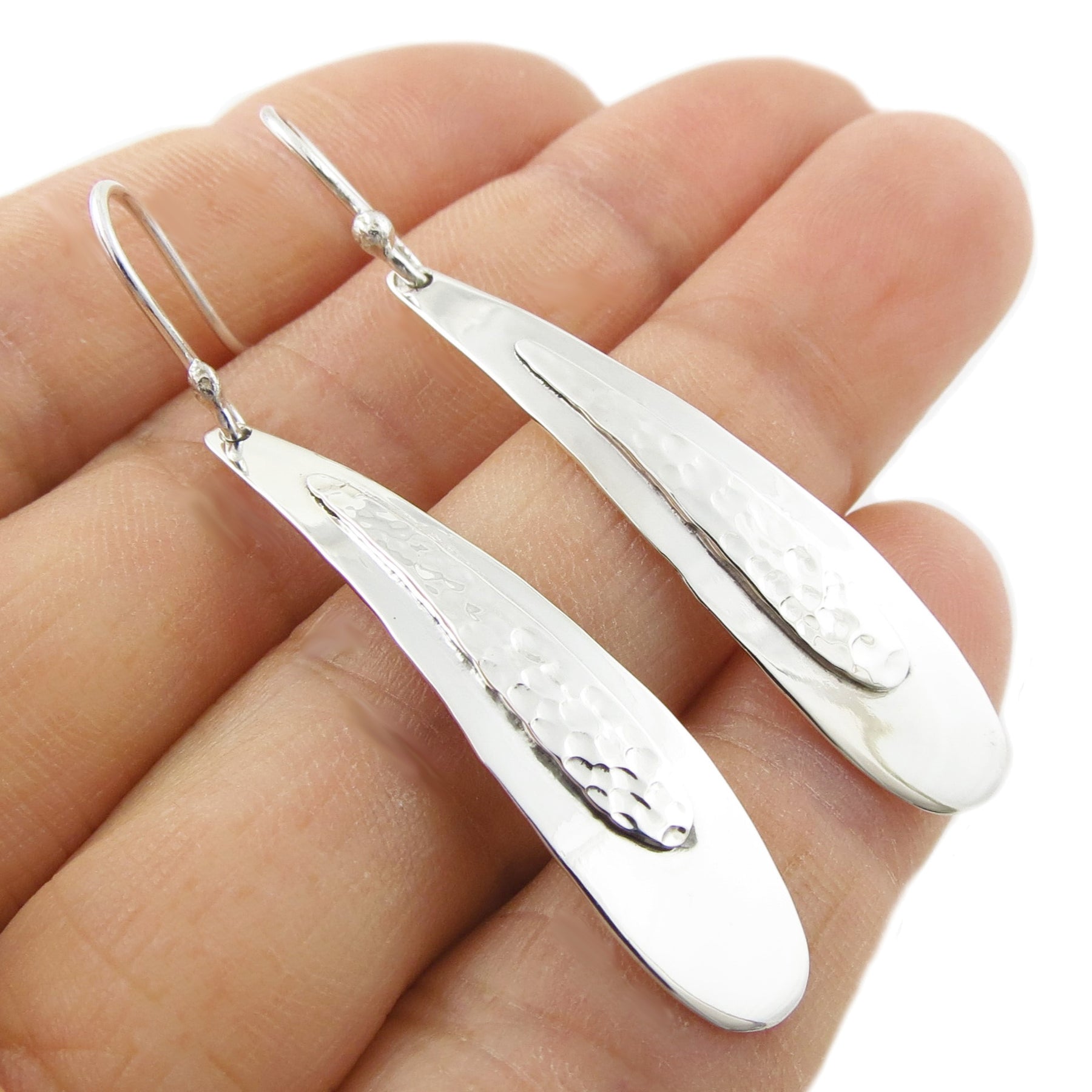 Delicate hammered detailing is expertly inlaid along the centre of each drop, adding rich textural contrast and artisanal charm. Hand-wrought from solid 925 sterling silver, these earrings offer a striking yet refined finish that speaks to quality and craftsmanship.