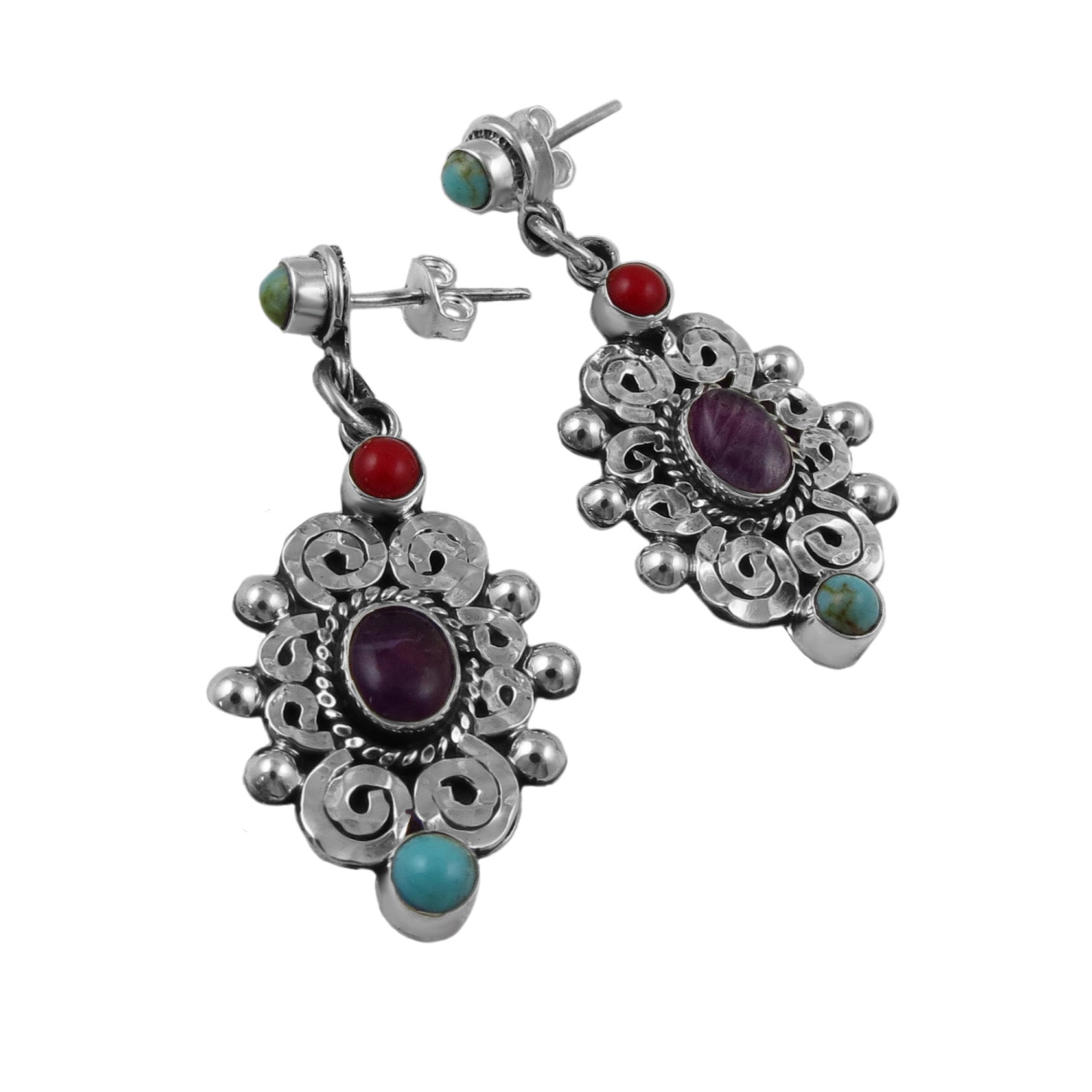 Inspired by the richly detailed Renaissance jewellery of Matilda ‘Matl’ Poulat, these ornate 925 Silver Earrings blend history, colour, and craftsmanship in a truly striking design. Intricately worked scroll motifs are both polished and antiqued for depth and contrast, while amethyst gemstones and vibrant turquoise and coral-coloured inlays bring a warm, timeless richness to the piece.