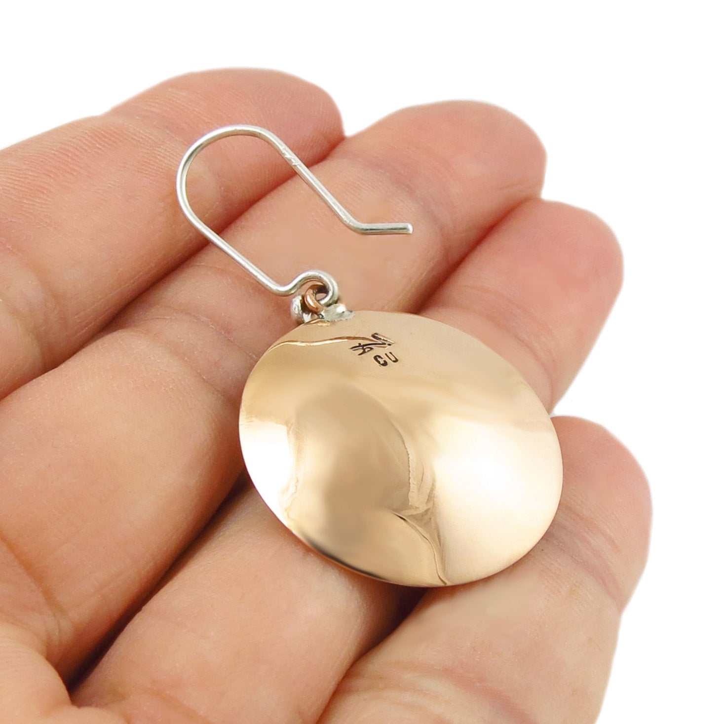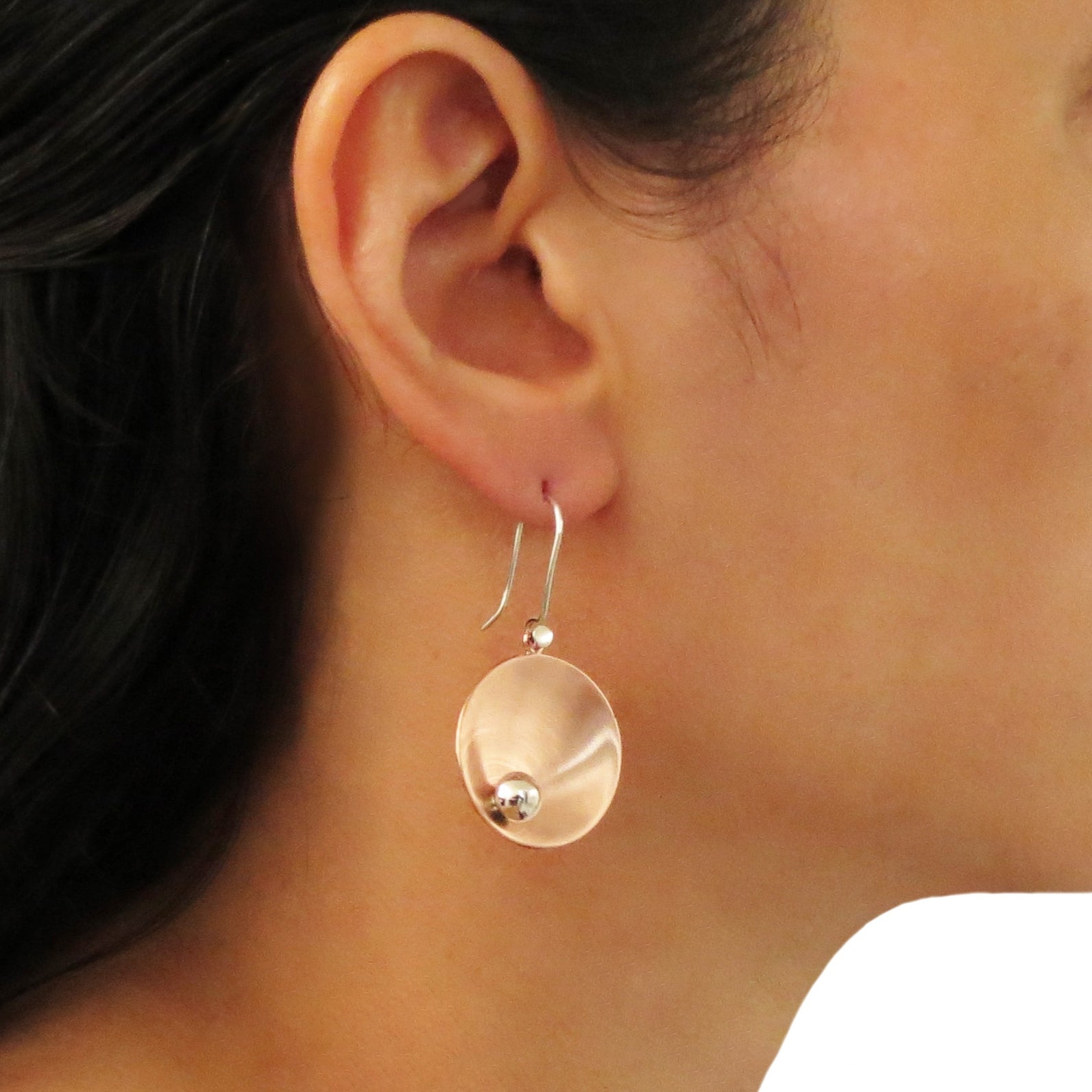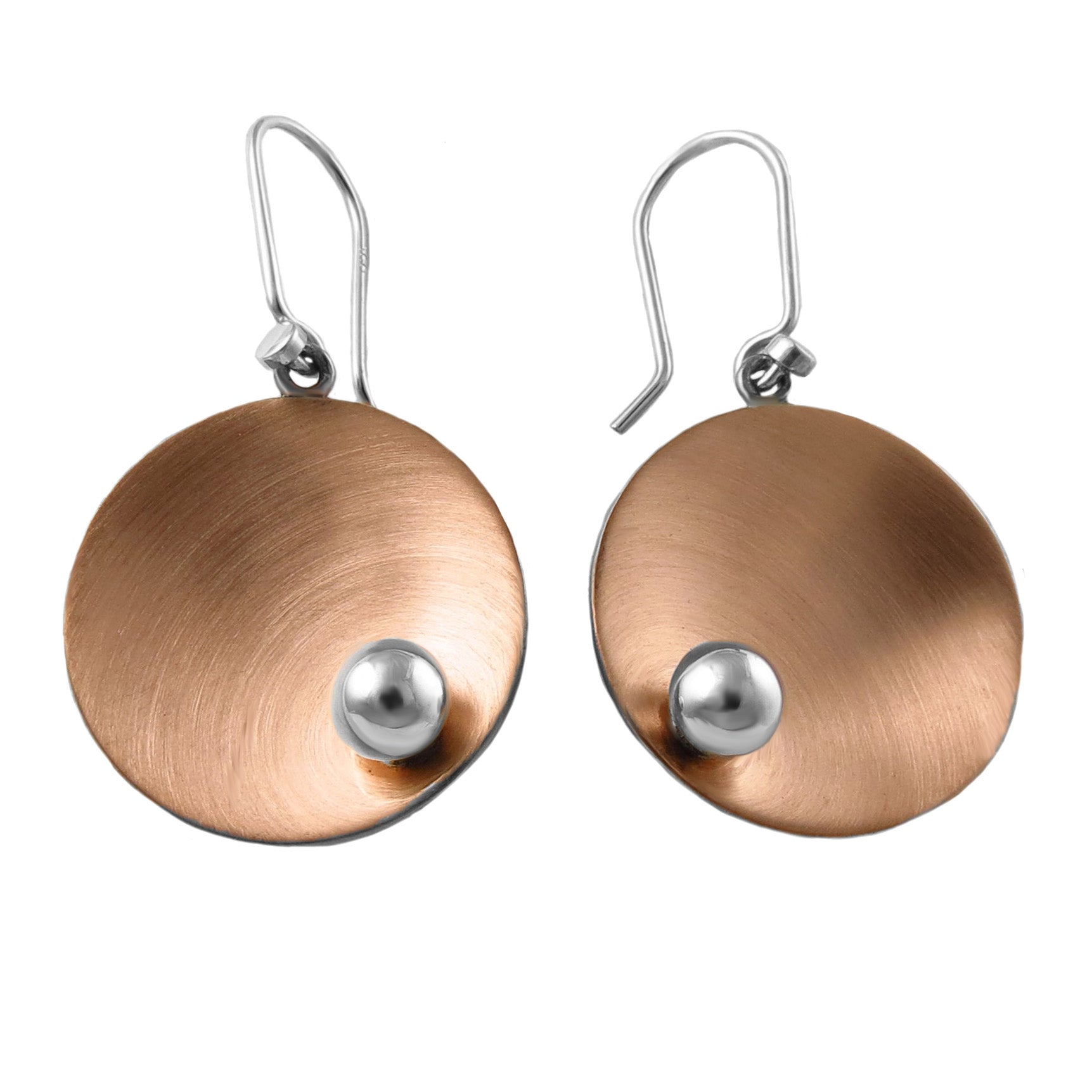 Bold and contemporary, these handcrafted earrings feature large brushed copper circles accented by a single solid 925 silver bead—a beautiful contrast of warm earthy copper and cool edgy silver tone. These striking Mixed Metal Earrings offers a unique, artful touch that's both modern and versatile.