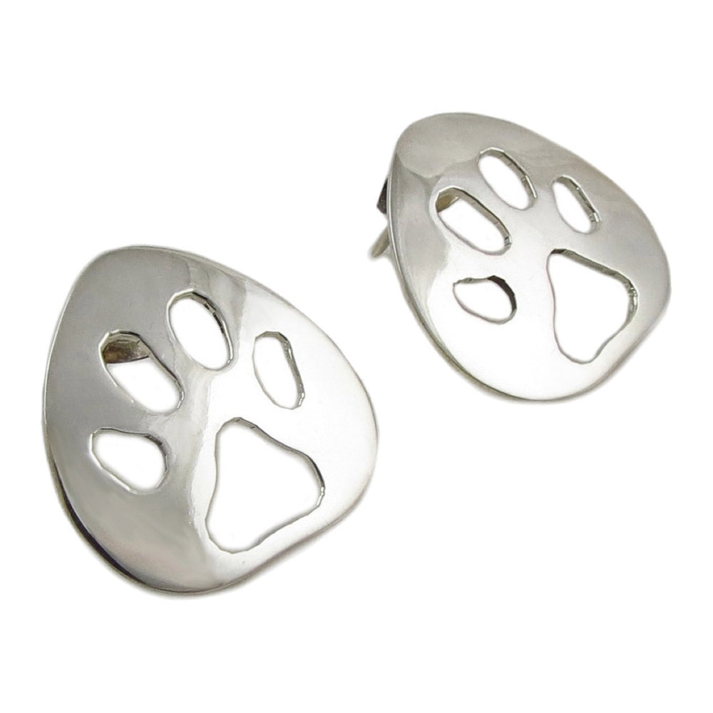Large paw-print cutouts decorate a solid polished base in these animal inspired Silver Earrings. The shapes hang on post fasteners and the earrings are supplied in a gift box.