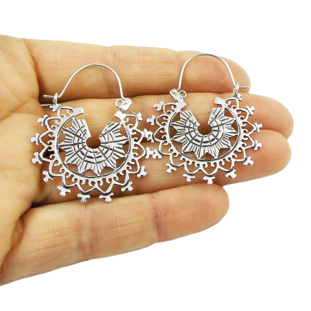 Intricately crafted, these large creole drop earrings feature ornate patterns that beautifully radiate from the centre of delicately cut-away circular shapes, creating a design that is both striking and uniquely original. The detailed openwork adds depth and texture, making each earring a captivating statement piece.
