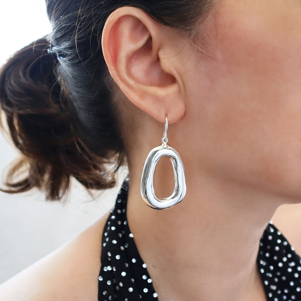 Long organic oval forms hang on secure ear hooks to form these stunning sterling silver dangling earrings.