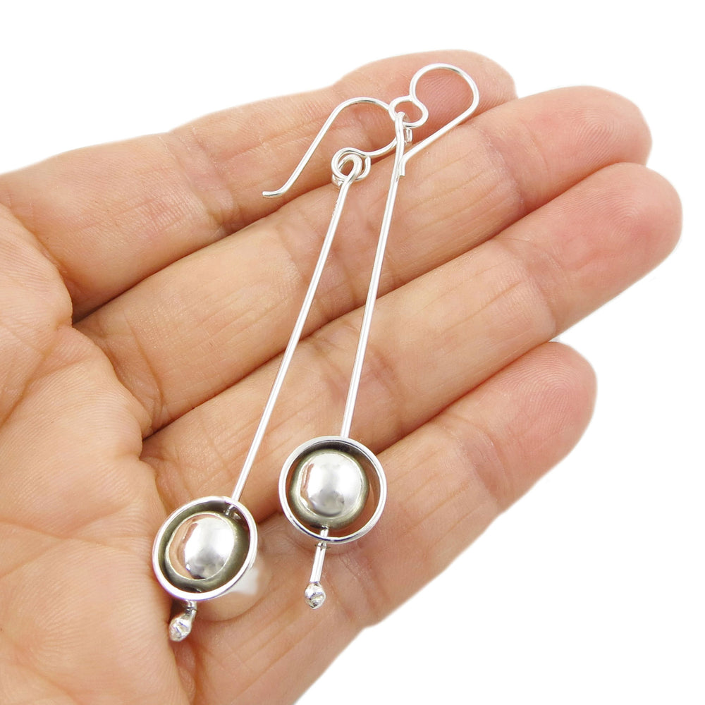Wrought from sterling silver, the ball beads move on the long stick drops and are the perfect style to accentuate the long curve of the neck.