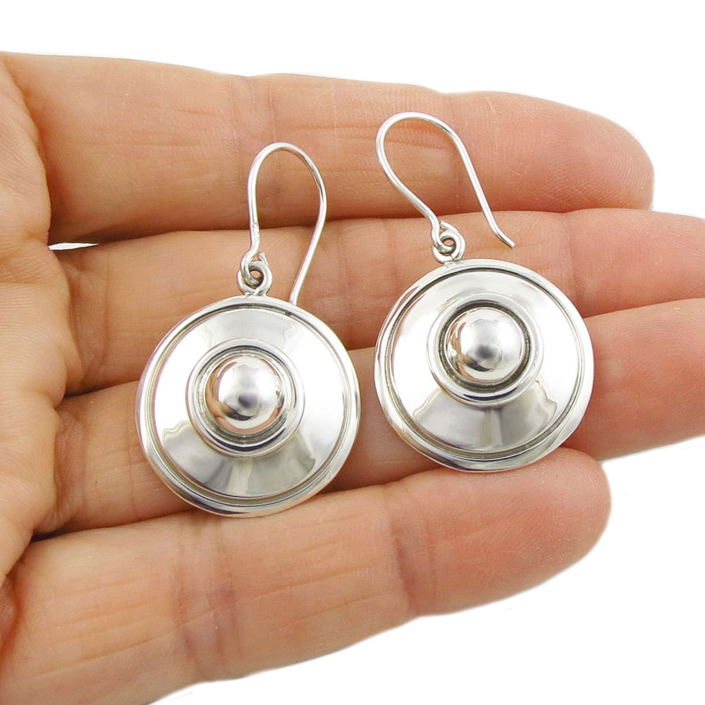 Classic silver beads decorate the centre of our statement disc 925 silver earrings. Wrought from sterling silver, this sleek design features bold circles hanging on long ear hooks.