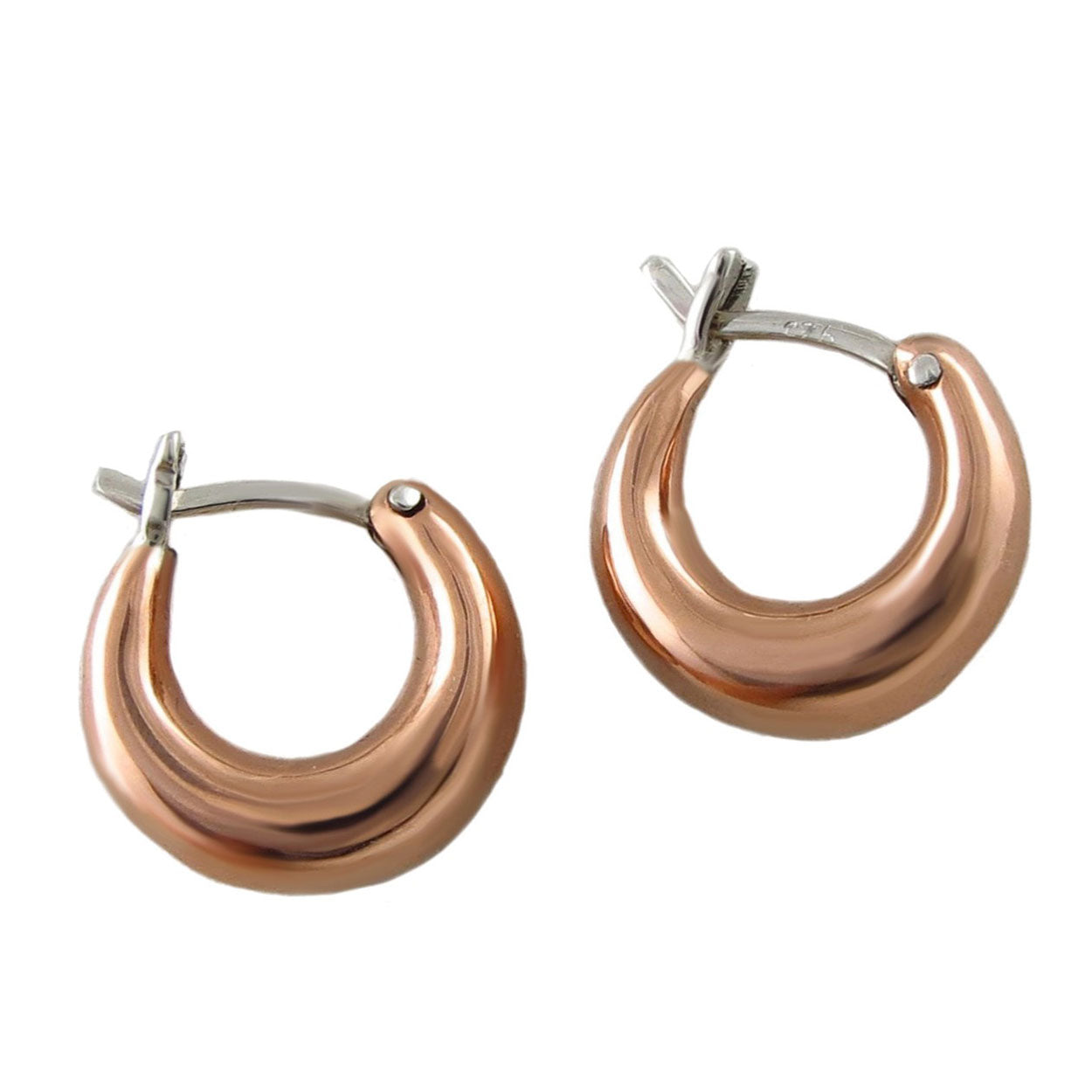 Solid copper hoops hug the ear lobe in these fitted two tone earrings for women. Expertly hand-wrought and with a smooth, polished finish, these stylish circles hanfg on hinged 925 silver posts.