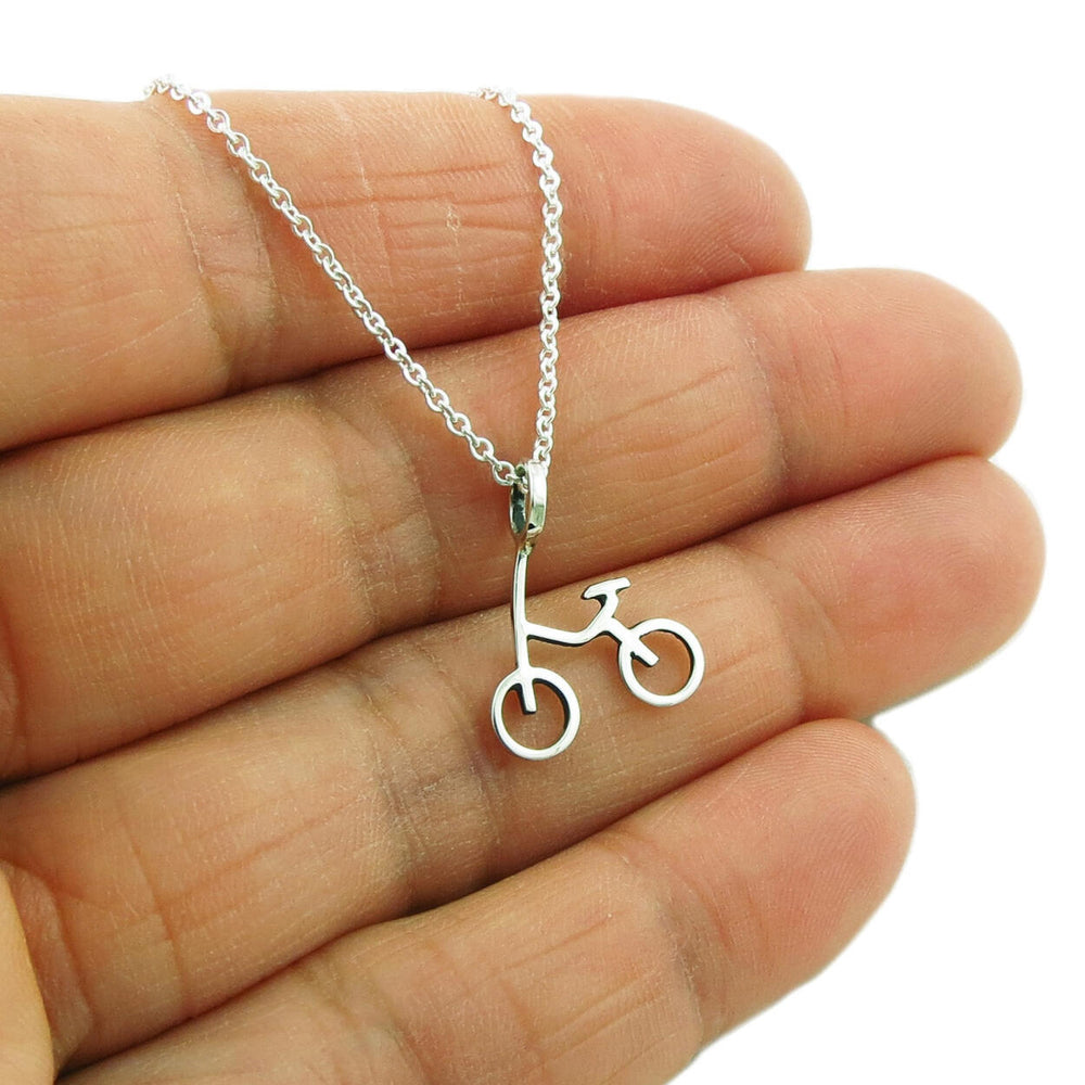 The perfect gift for a cyclist or sports enthusiast, this elegant necklace features a sturdy bicycle hangs on a circle link chain.