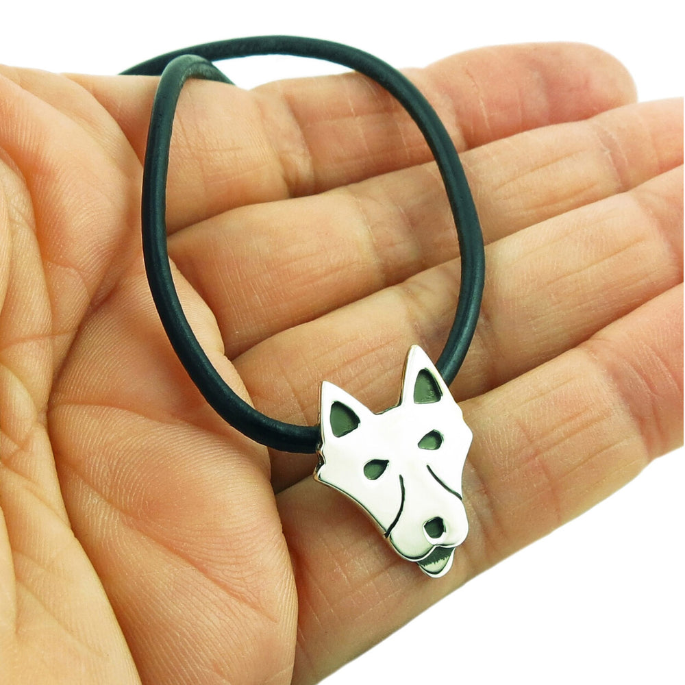 Break away from the pack with this bold wolf design. The eternal symbol of bravery and strength, our delightful wolf is rendered in solid silver and hangs on an integrated double bale from a black leather cord.