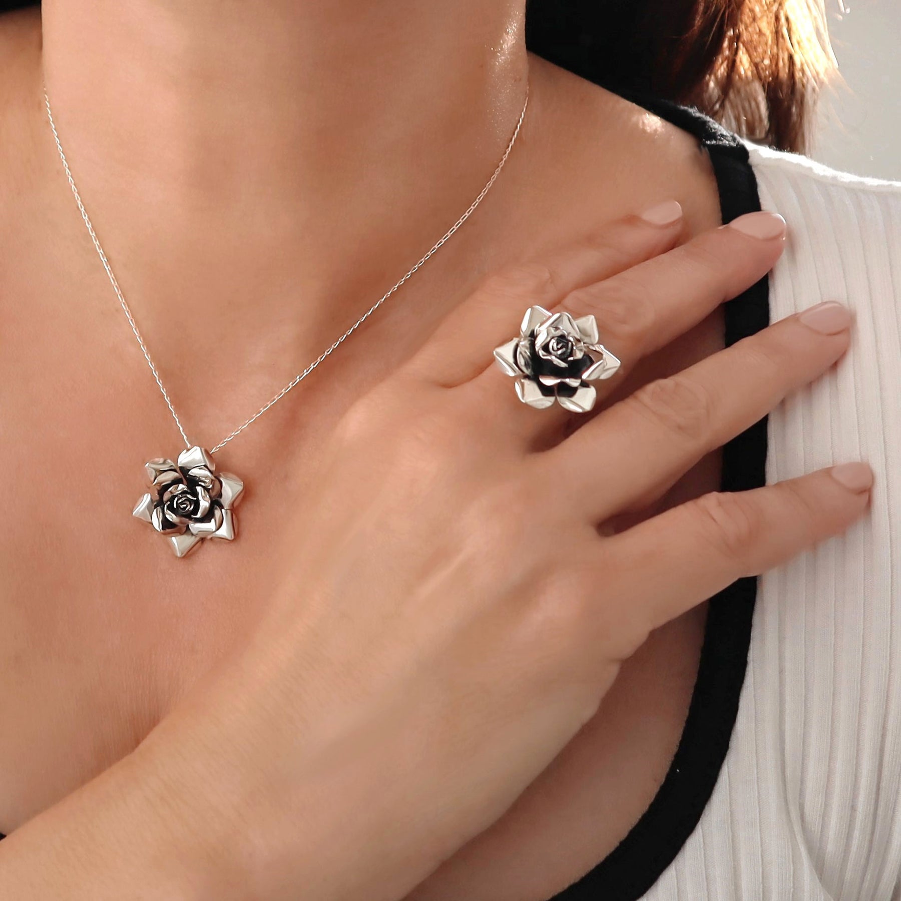 Gift a rose that lasts - the beauty of a single rose is celebrated in this unique sterling silver flower pendant for women.