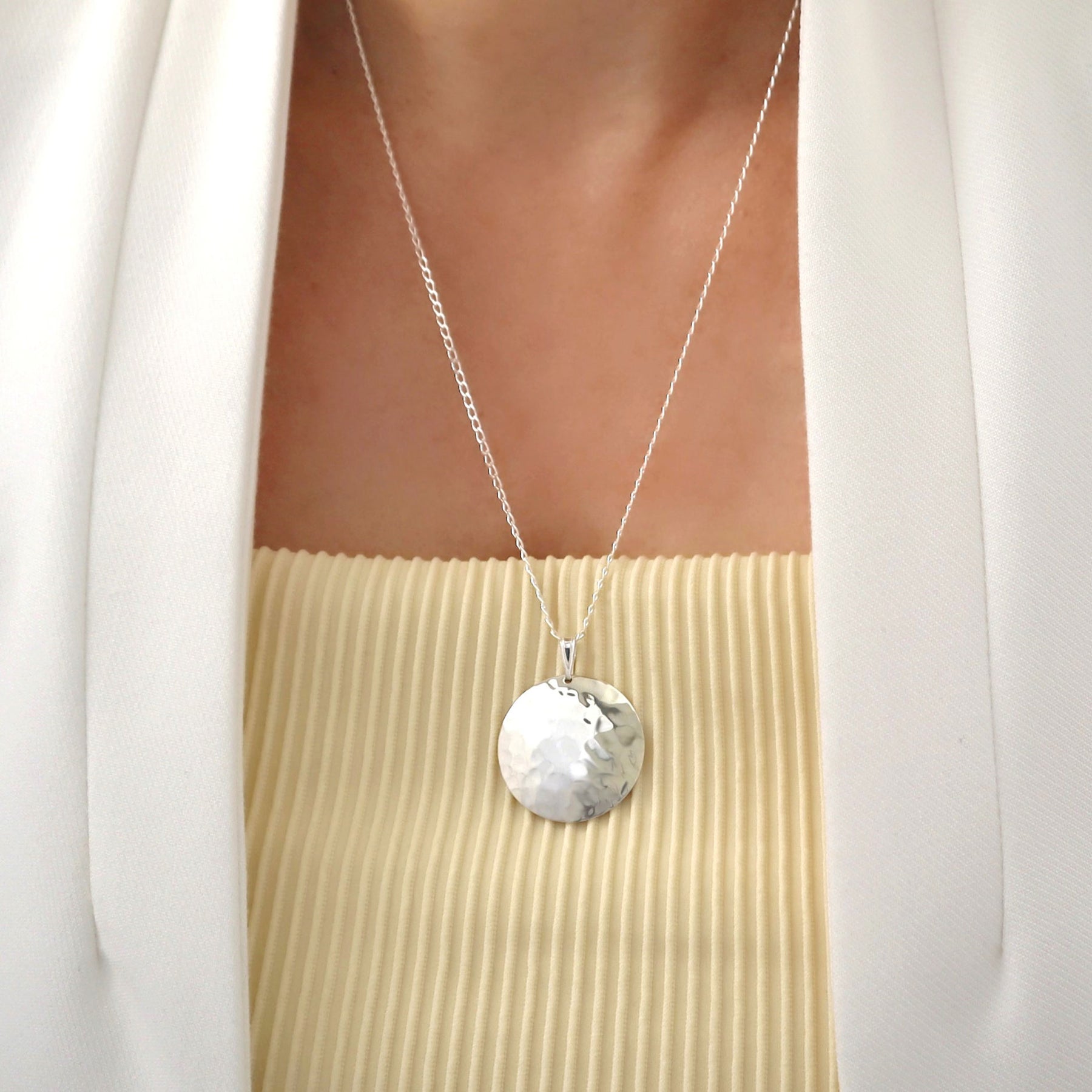 For those days when you need an un-fussy piece of jewellery in a classic shape. A hand-hammered circle disc is the centre-piece of this sterling silver necklace. With a slightly tapered edge for added refinement, this elegant everyday design is the perfect gift or day to night accessory.