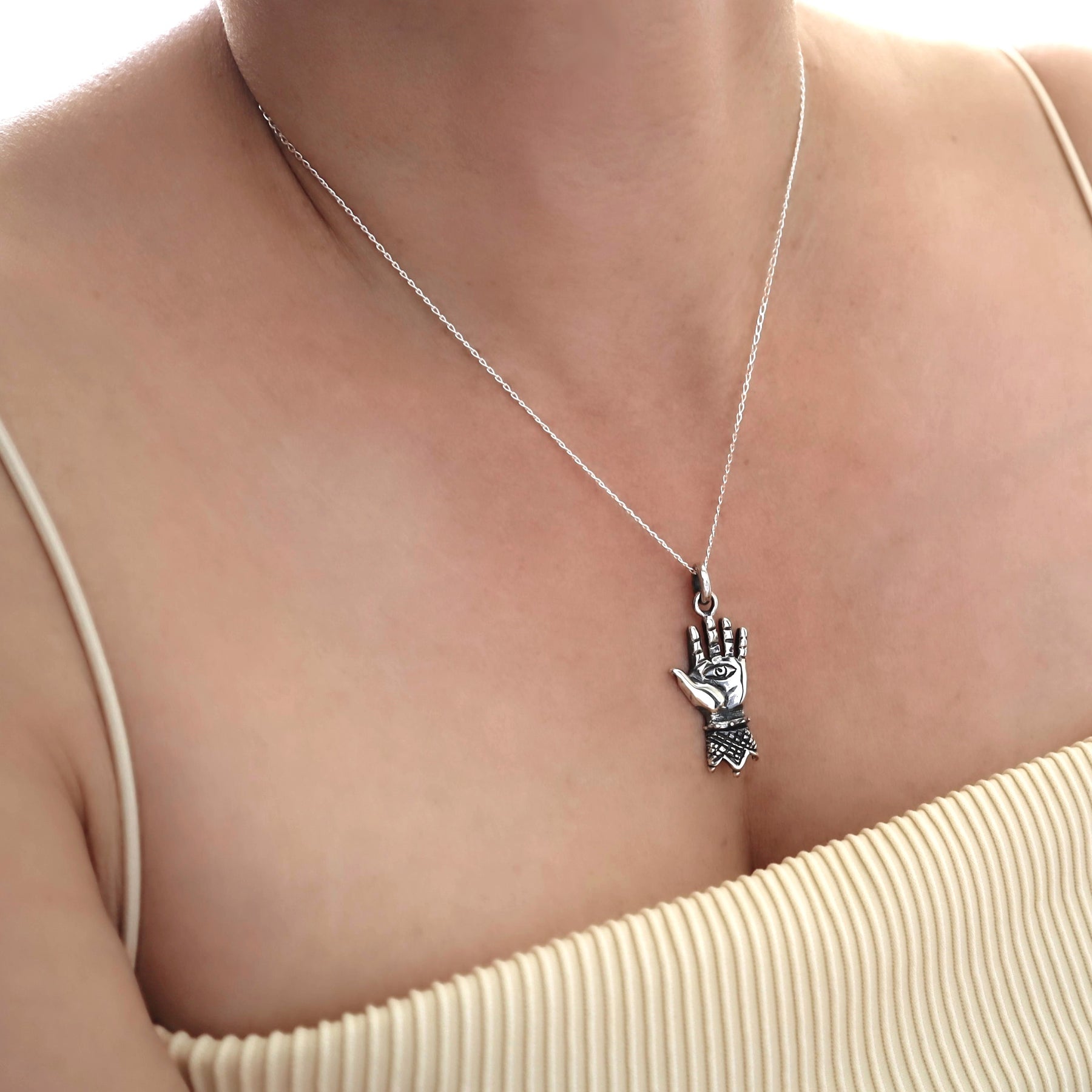 Designed by Maria Belen Nilson and inspired by the hand of Hamsa used to protect against the evil eye, this fabulous pendant features a hand decorated with a large eye motif.
