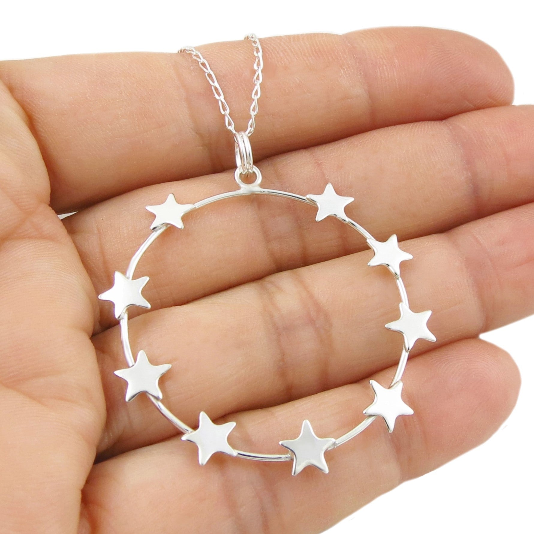 Celestial star shapes decorate a wide circle hoop in this whimsical silver pendant necklace. The stars have a polished finish. Why not add a curb link chain from our collection to complete the look. Lengths available from 16" to 30", just choose the length from the drop down menu.