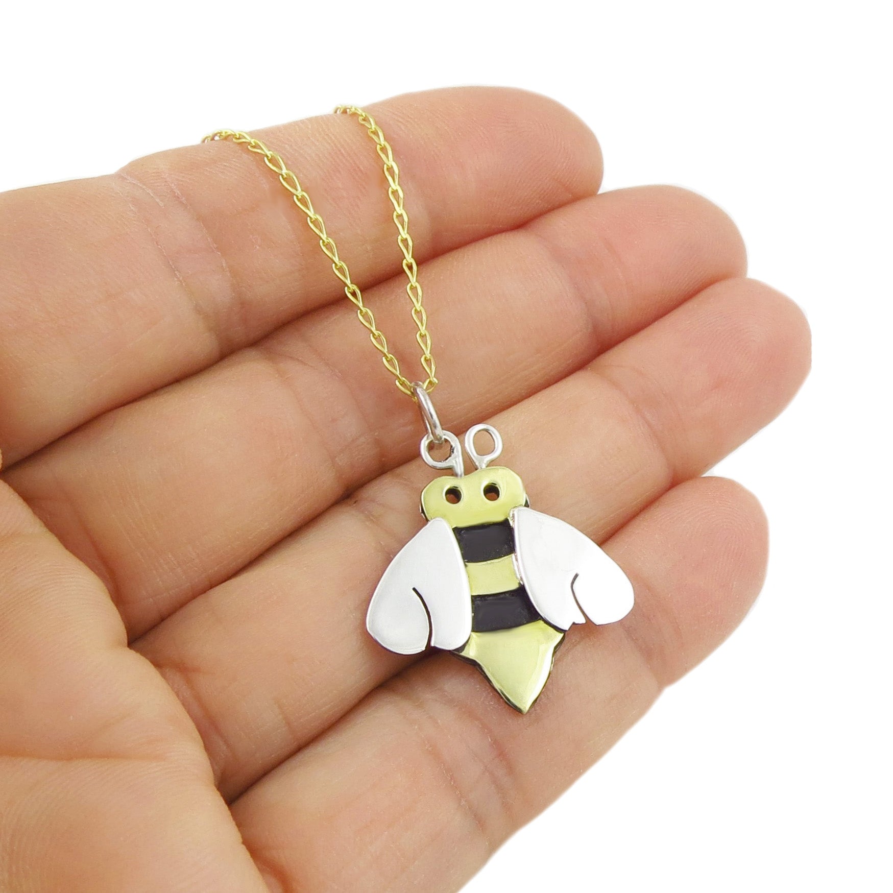 A pretty mixed metal honeybee hangs on a circular bale in this delightful mixed metal pendant and chain necklace. Wrought from solid 925 silver and gold coloured brass the pendant has a polished finish and is supplied in a gift box. Matching earrings are also available in our store.