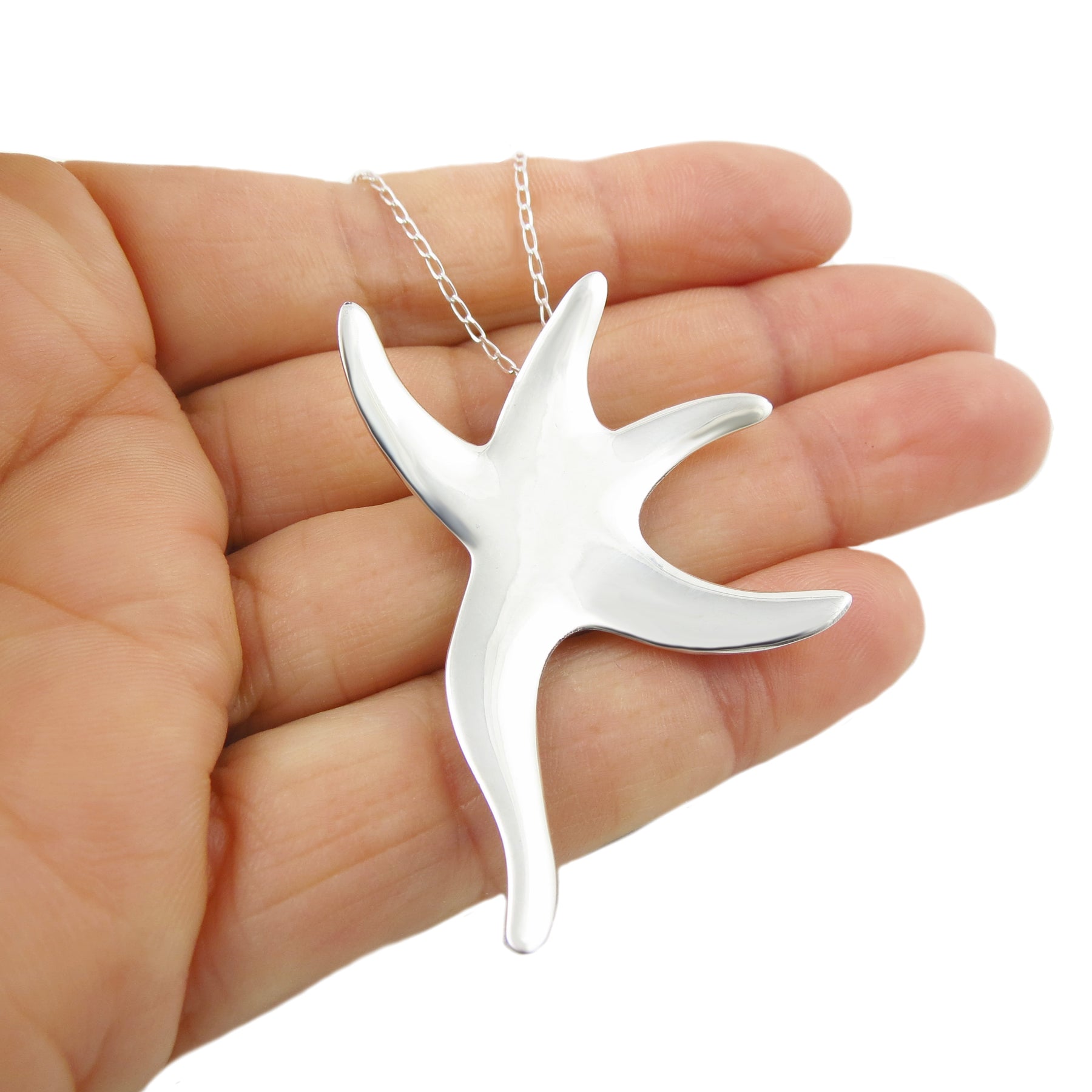 Live life below the waves with this large shiny sterling silver pendant necklace in the shape of a n alluring starfish. With no eyes to see and relying only on their sense of touch the starfish is truly a symbol of blind trust and it's symmetry lends itself naturally to jewellery design.